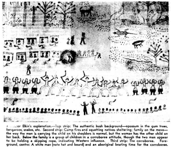 Professor Elkin's explanation. - Top strip: The authentic bush background - opossum in the gum trees, kangaroos, snakes, etc. Second strip: Camp fires and squatting natives sheltering; family on the move, the way the man is carrying the child on his shoulders is normal, but the woman has the other child on her back. Below the family is a group of children in a corroboree attitude, though the two men appear to be holding a skipping rope, indicating Western influence. Third strip: The corroboree. Foreground,, centre: A white man (note hat and beard) and an aboriginal beating time for the corroboree.